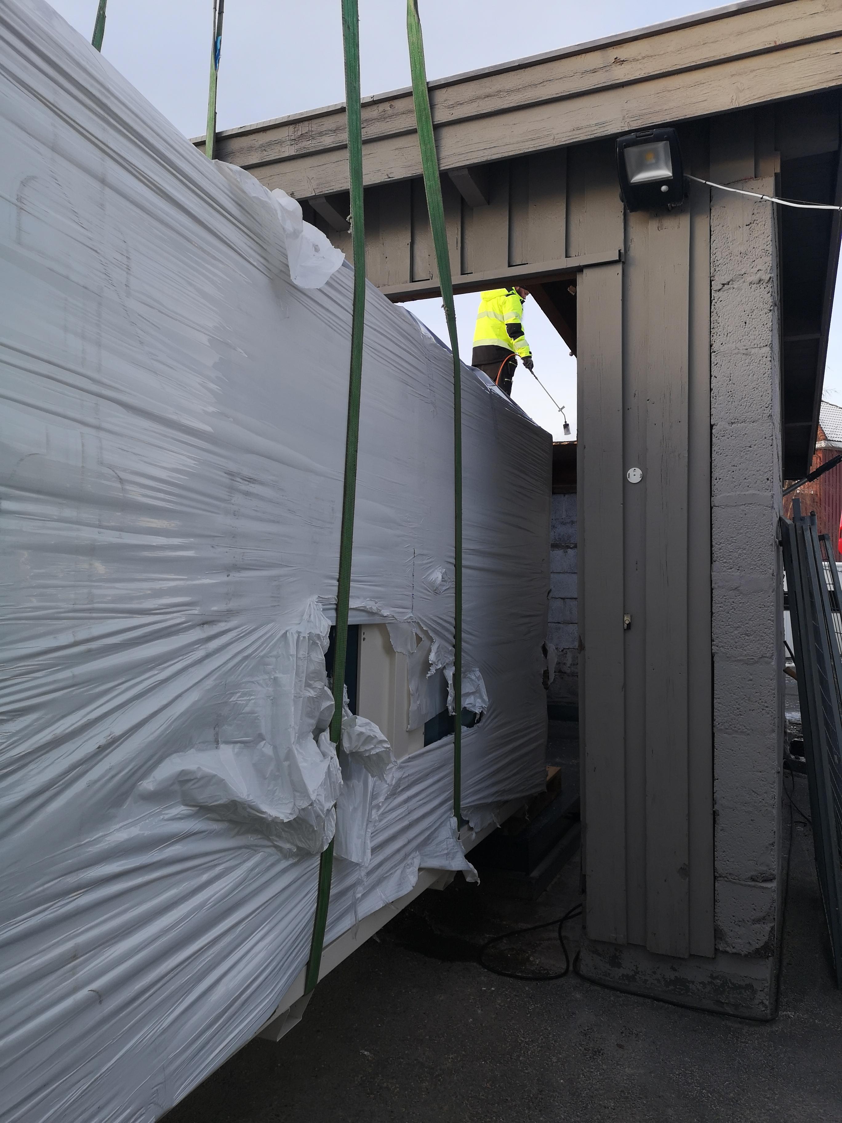 01.12.2024: Neste store milepæl kommer på plass. Vi installerer varmepumpe for å ta hånd om oppvarmingen. Det er en luft til vann pumpe som avgir opptil 150 kW varme med et forbruk på rundt 50 kW. Utfordringen ved en så stor maskin midt i byen kan jo være støyforurensning. Vi har valgt en “Low Noise” utgave. I tillegg er den satt inne i en garasje med åpninger vekk fra naboer for å fjerne resten av støyen.